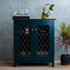 The cabinet doors are adorned with mirrored panels and a delicate lattice pattern, blending artisan craftsmanship with contemporary aesthetics. The unique floral knobs and the cabinet’s bold green finish add a pop of color and charm, making it a centerpiece for any room.