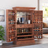 The wide doors open to reveal multiple shelves that provide easy access and secure storage for liquor bottles, glasses, and bar essentials. -